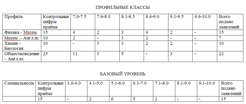 К конкурсу в средних школах для освоения содержания образовательной программы среднего образования допускаются абитуриенты, у которых в свидетельстве об общем базовом образовании отметки по каждому из учебных предметов, которые выбраны для изучения на повышенном уровне, не ниже 7 (семи) баллов и средний балл свидетельства об общем базовом образовании (средний балл итоговой аттестации в год приема (зачисления)не ниже 7 (семи) баллов.
